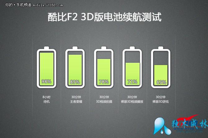▲试玩裸眼3D网游 从实际的体验来看,酷比F2 3D版畅玩目前主流的网络游戏(例如:王者荣耀、绝地求生:刺激战场)还是没有任何问题的。这样的性能在目前同价位的产品中也能站稳脚跟。 酷比F2 3D版续航:3300mAh中规中矩 而在续航方面,酷比F2 3D版搭载了一块3300mAh的电池,这样的容量只能说中规中矩。同时,我们把3D录像也加入到功耗测试中,看看在3D录像模式下,手机是否会消耗更多的电量。下面我们就来看一下实际的功耗表现吧。